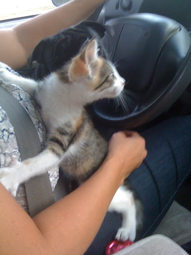 My ride to work was kinda like being a part of a portable petting zoo. Ruby always sits on my lap…and Mayhem decided that she should, too. Col. Mustard, he perched on my shoulder. Guess he’s gonna be an “up-high cat”.