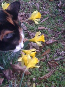 Check out Kitty G checking out the daffodils in my backyard. How sweet is that?
