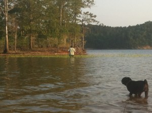 El Jefe and I took the mutts to Lake Ouachita this weekend. We arrived Friday afternoon, loaded everyone onto the party barge and took off to find the end of the earth.