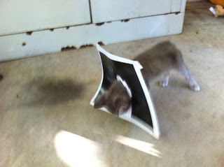 Now, don’t let the Billboard of Shame fool you. It hasn’t slowed turbo-kitteh down one iota. As a matter of fact, I think it contains the powers of super speed and agility with an increase of +30 in Spazztasticness. He rocks that billboard, is what I’m saying.
