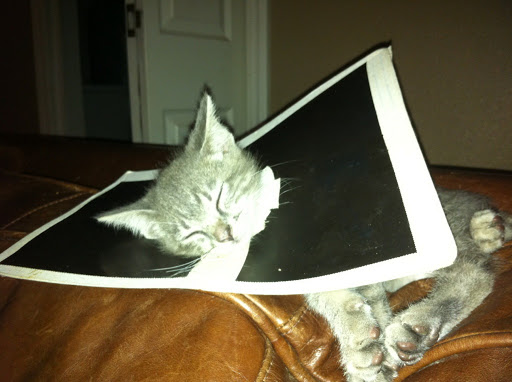 Bobcat Greyskull returned to us last night, and he is officially a “bobcat.” His tail has been snipped appropriately and in order to keep him from pulling out his stitches, he was placed in the cone billboard of shame.