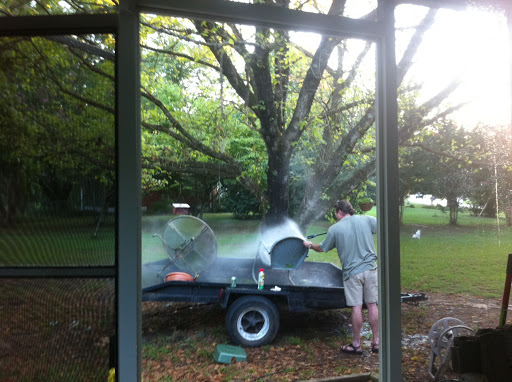 Sunday, after many morning hours of lounging in the hammock…I finally got vertical, grabbed a beer and jumped onto the John Deere to get my mowing on. The Compound was starting to look a little overgrown…especially after getting rained on for 3 days last week. I mowed for probably 3 hours or so, then Jefe came back over and he pulled out the big guns…and started to power wash the porch and the patio furniture I want to repaint.