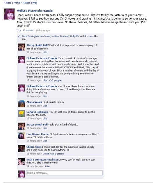 So yesterday I got probably a half a dozen inbox messages from FB friends urging me to participate in the latest “Breast Cancer Awareness” status update game. Last year, it was “Post the Color of Your Bra”, which at least somehow made sense–Bras–Breasts–ah ok.