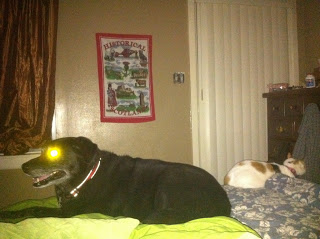 Notice the butt-to-butt placement of Black Dog/White cat Dog. These two adore each other in reality, but when they have an audience, they totally ignore each other.