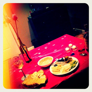 Last night, we had a quiet, candlelit nosh. I made us a fun little cracker and cheese plate, we had our wine & scotch, and a table cloth with all kinds of fun love stickers. Including ROBOTS. Robots make everything better.