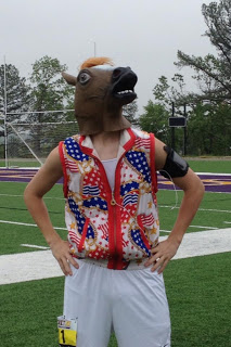 He didn’t run wearing the horse head, that belonged to a friend. He did, however, run wearing that awesome shirt.